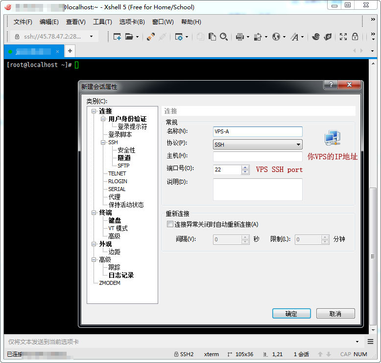 填写IP、端口即可,我为了安全起见没有保存用户名和密码,如果对Xshell足够放心也可以保存。